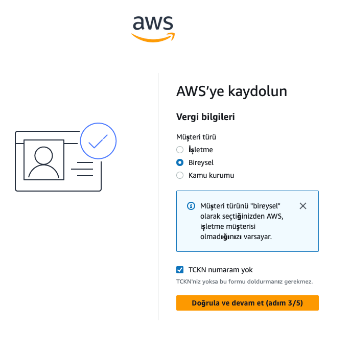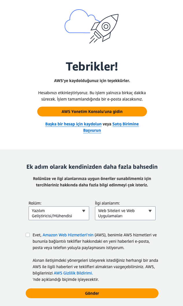 Yeni hesabınız hayırlı olsun! AWS hesap numaranızı (account ID) ve root kullanıcı email/şifrenizi bir kenara not etmeyi unutmayın.