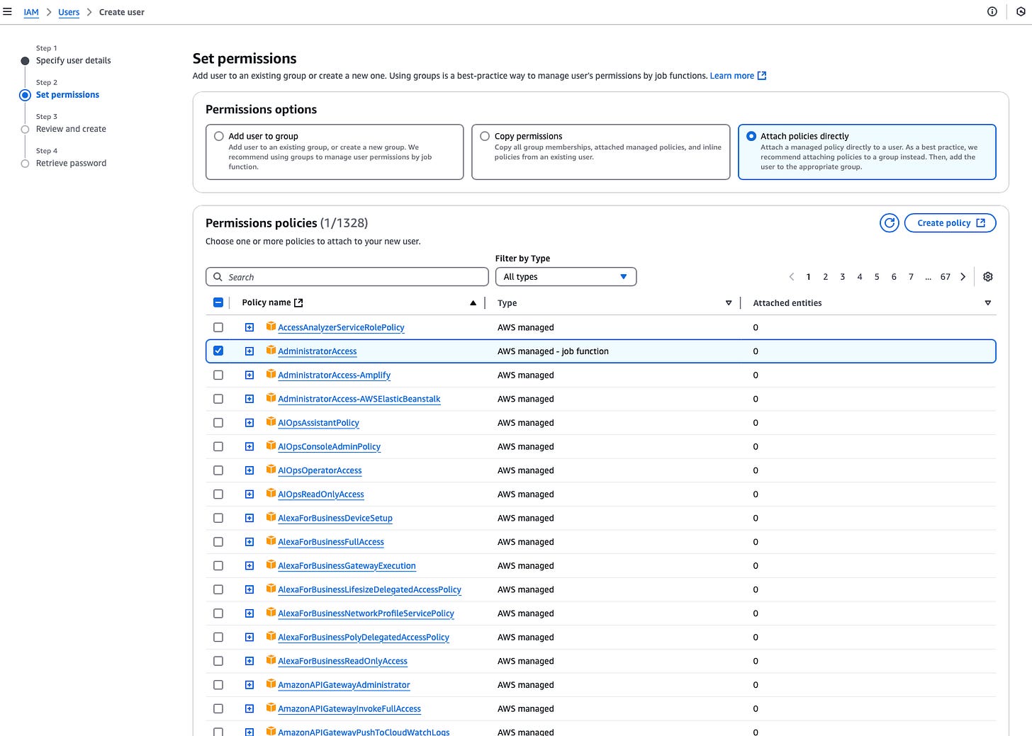 Şimdi kullanıcınızın yetkilerini belirleyeceksiniz. Burada isterseniz bir “grup” oluşturabilirsiniz veya mevcut bir kullanıcının yetkilerini kopyalayabilirsiniz. Ya da benim seçtiğim gibi “Attach policies directly” diyerek AWS’in hazır sunduğu policy’lerden seçebilirsiniz. Ben bu şekilde “AdministratorAccess” yetkilerini seçtim. Her policy için yandaki + işaretine tıklayarak detaylarını görebilirsiniz. Mesela AdministratorAccess şöyle tanımlanmış: