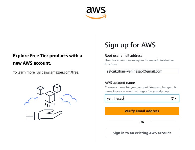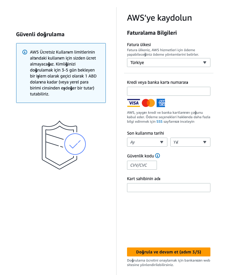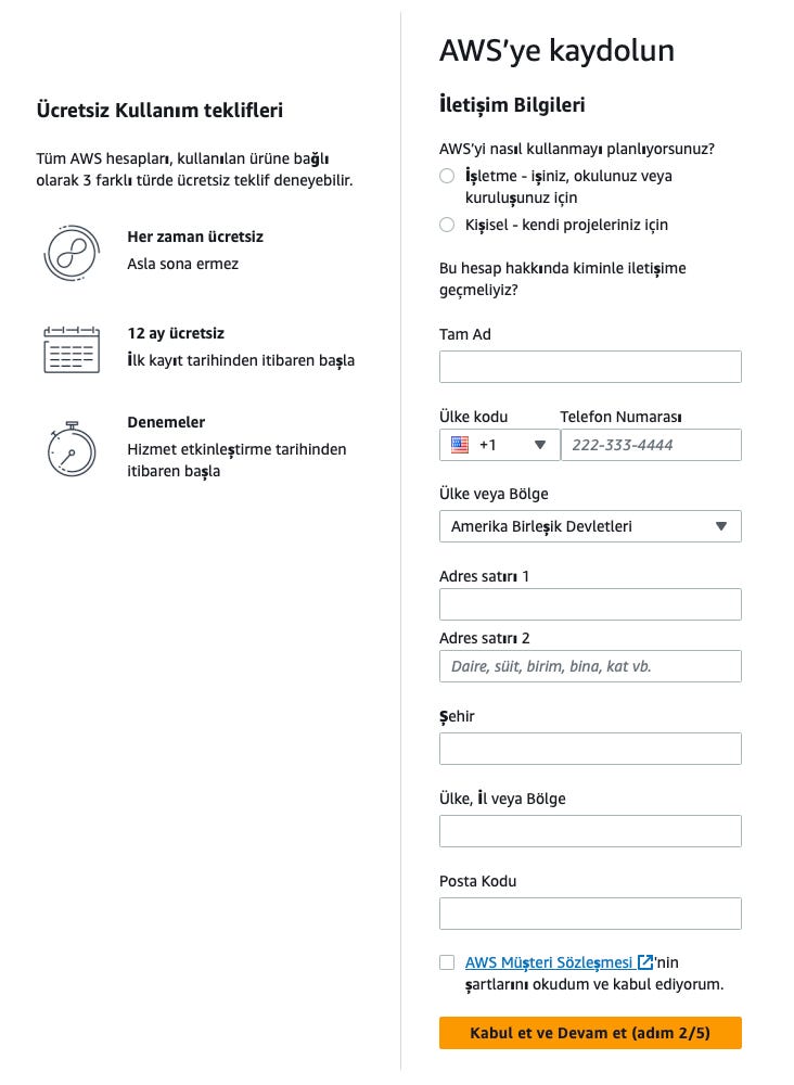 Bunlar hazırsa, https://aws.amazon.com adresinden “Get started for free” butonuna tıklayarak süreci başlatabilirsiniz.