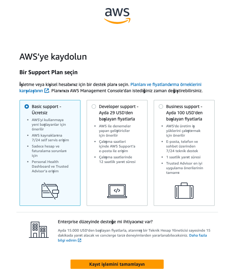 Son adımda ise bir destek planı seçmeniz isteniyor, ücretsiz olarak gelen “basic support” seçeneğiyle hesabınızı açabilirsiniz.