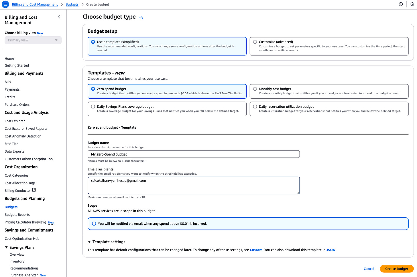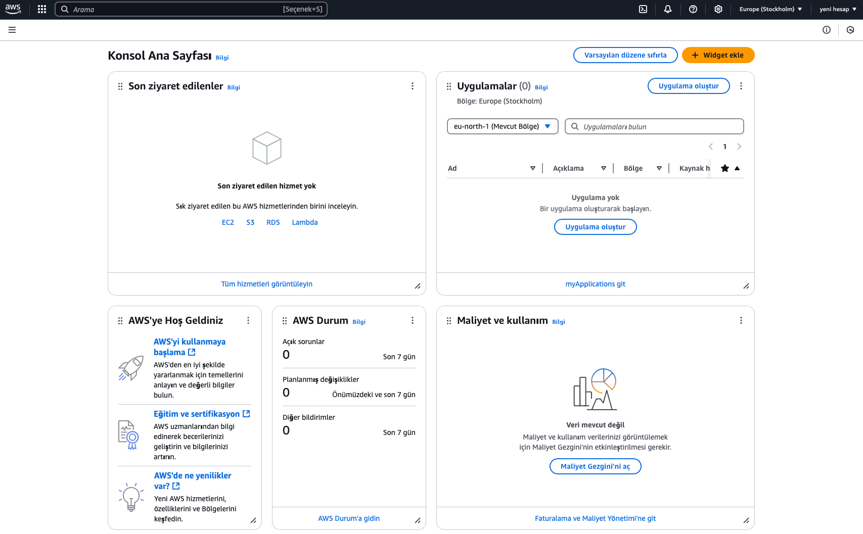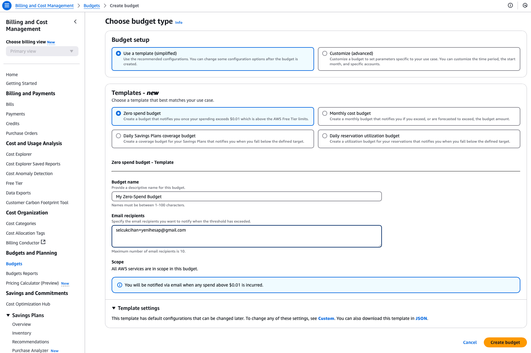 Hesap açılışından sonra yapacağınız ilk iş “Billing” servisinden bir fatura alarmı oluşturmak olsun. https://us-east-1.console.aws.amazon.com/costmanagement/home?region=eu-north-1#/home sayfasını açın ve burada tavsiye edilen aksiyonlar kısmında “Create budget” bağlantısına tıklayın. Gelen ekranda bildirim almak istediğiniz email adresinizi yazın. Böylece 1 kuruşluk bir harcama olsa bile emailinize bir bildirim gelecektir. Bu sayede eğer unuttuğunuz veya istemediğiniz bir kullanım varsa gereken tedbiri erkenden alabilirsiniz.