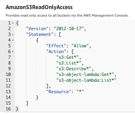 Yetkiler “policy” adı verilen ve JSON ile tanımlanan yapılarla temsil ediliyor. Kendi özel policy’lerinizi oluşturabilirsiniz. Ayrıca AWS tarafından sağlanan önceden tanımlanmış policy’ler de var. Mesela kullanıcınıza S3 için okuma izni verecekseniz, hazırdaki şu policy işinizi görecektir: “AmazonS3ReadOnlyAccess”.