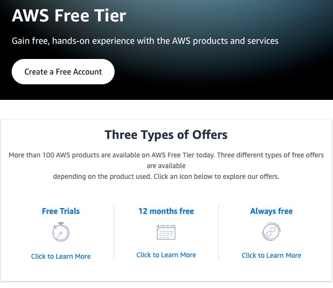 AWS’teki pek çok servis, belli koşullar dahilinde ücretsiz (free tier). Üç farklı ücretsiz kullanım türü sunuluyor: