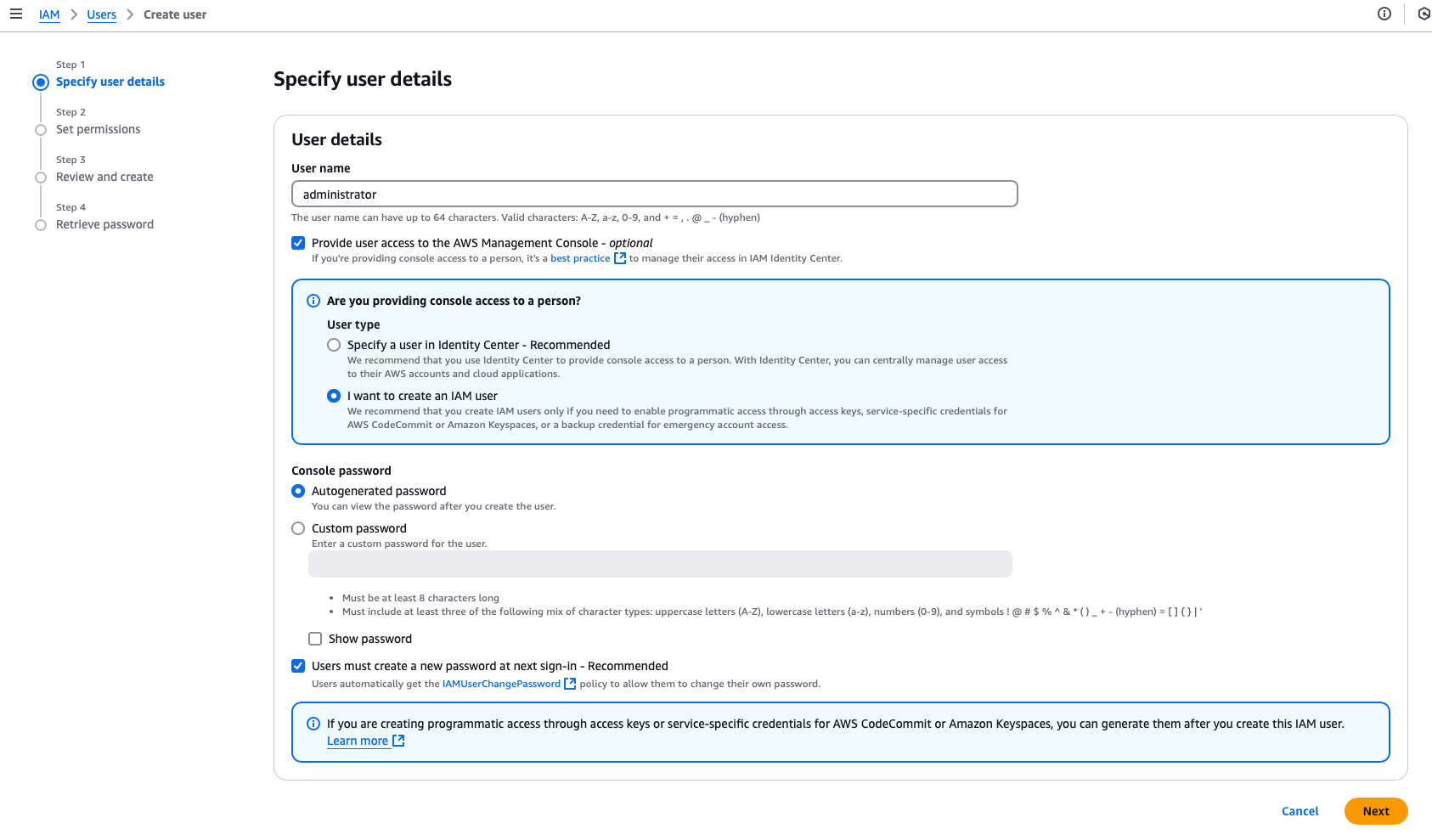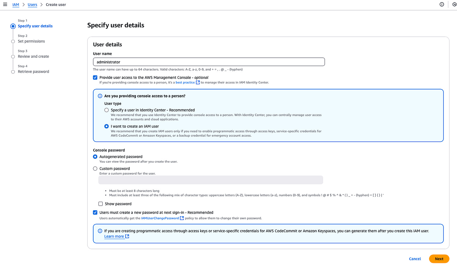 Yukarıda bahsettiğim gibi, root kullanıcısını bir kenara bırakabilmek için kendimize bir “admin” kullanıcısı oluşturalım. IAM ekranında kullanıcı isminizi ve şifrenizi seçin.