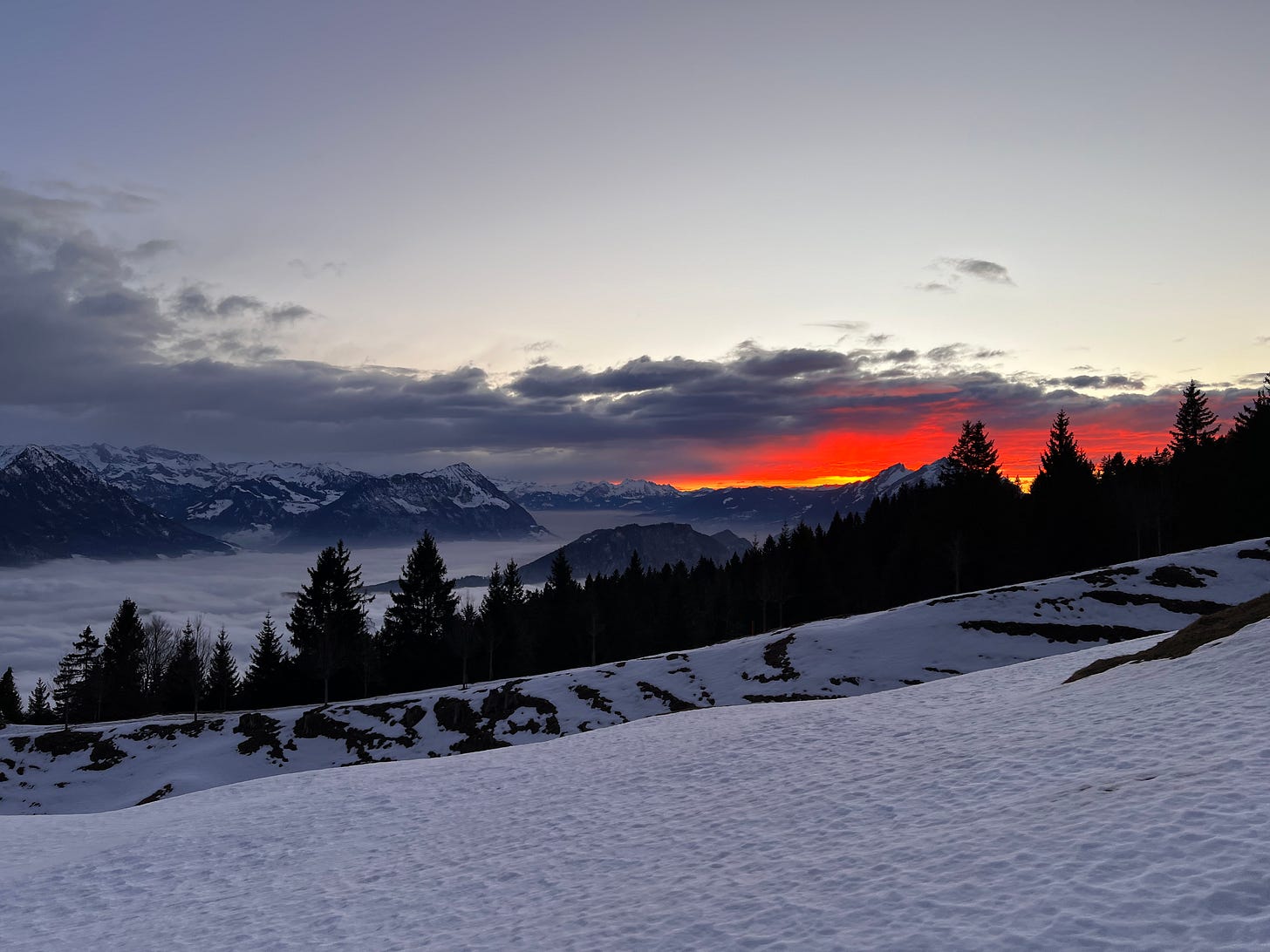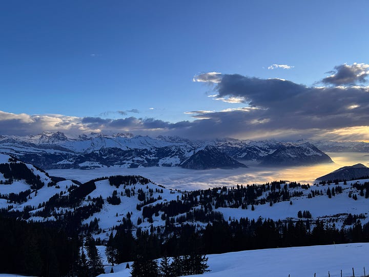 Vitznau’da tekneden indiğimiz iskeleden yaklaşık 50 metre yürüyerek saat 15:30 gibi hareket eden trene bindik ve 16:00 civarı dağın tepesindeydik. Dönüşte son tekne seferine yetişebilmemiz için dağda sadece bir saat kalabildik. Zaten güneş de batmak üzereydi ve güneşi batırıp dönüş için trene atladık.