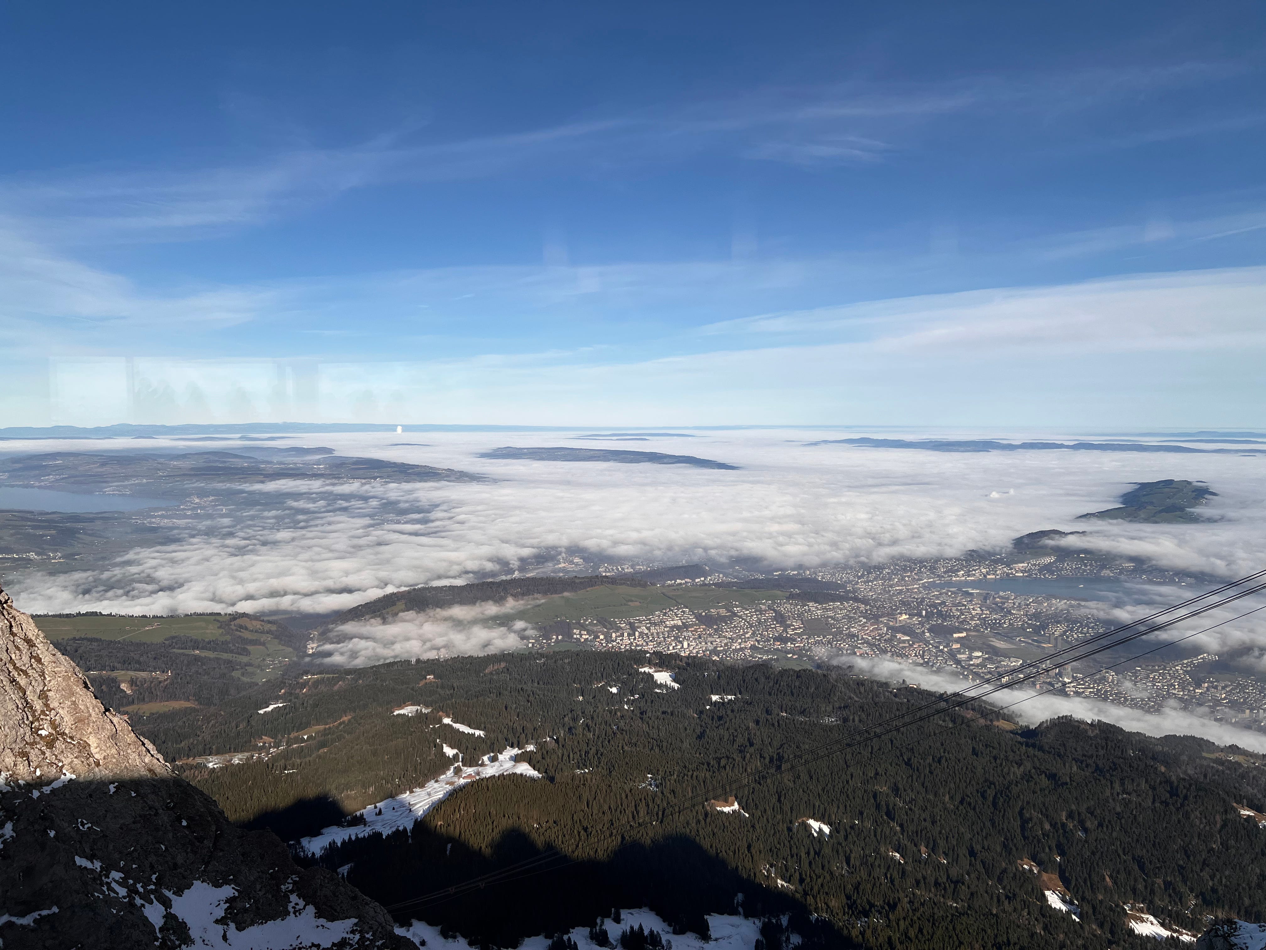 Pilatus Dağı’ndan Luzern ayaklarınızın altında, hele de gölün üstünde sis yoksa manzara çok daha güzel oluyordur eminim. Maalesef biz gittiğimizde Luzern ve göl genelde bulutlarla kaplıydı. Her ne kadar dağların zirvesi güneşli de olsa, aşağıya bakınca bulutlardan dolayı her tarafı göremeyebiliyorsunuz.