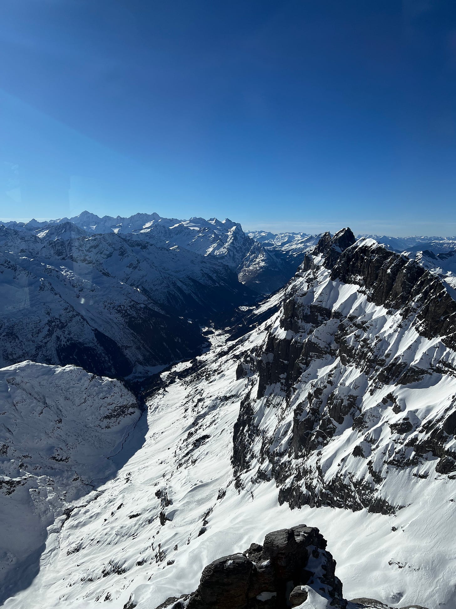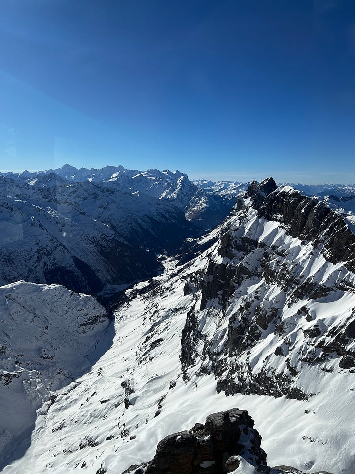 Önce bir teleferikle ara istasyona kadar çıkılıyor. Sonra daha büyük ve 360 derece dönen başka bir teleferikle dağın zirvesine tırmanılıyor. Dönüşte Trübsee denilen ara istasyonda inip kızak parkurunda biraz kızak kaydık.