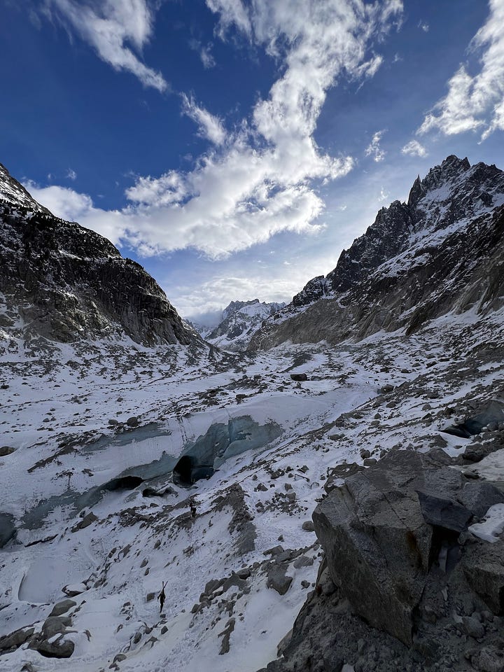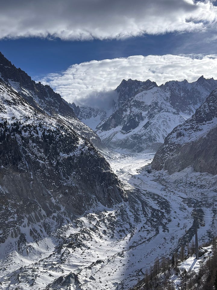 Chamonix’deki son günümüzde Montenvers trenine binip yakındaki bir buzul mağarasına gittik. Bu tren yarım saatte bir kalkıyor ve Mer de Glace’a yani buzulların olduğu yere gidiyor. Oradan da bir teleferikle buzulların yanına iniliyor. Buraya gitmenizi tavsiye ederim, inanılmaz manzaralar var. Koca dağların arasında pek güneş almayan bir yerde bulunuyor. Denizdeki dalgalar gibi görünüyor, 7.5 km uzunluğunda 200 metre derinliğinde bir buzul.